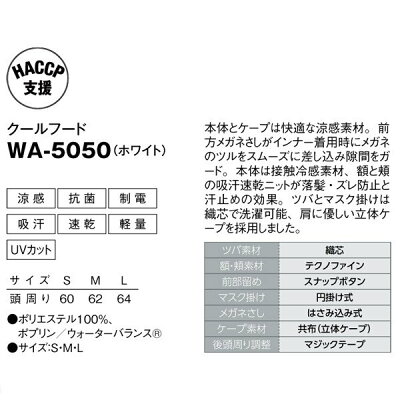 食品用ユニフォーム:帽子/フルフード サンペックスイスト/SUNPEXIST WA-5050 サンペックスイスト 食品用/工場用 帽子/フルフード WA-5050 クールフード ホワイト S〜L ポリエステル100%、ポプリン/ウォーターバランス サイズ:S/M/L ツバ素材:織芯|額・頬素材:テクノファイン|前部留め:スナップボタン|マスク掛け:円掛け式|メガネさし:はさみ込み式|ケープ素材:共布(立体ケープ)|後頭周り調整:マジックテープ フードタイプ HACCP支援 機能:涼感|抗菌|制電|吸汗|速乾|軽量|UVカット 本体とケープは快適な涼感素材。