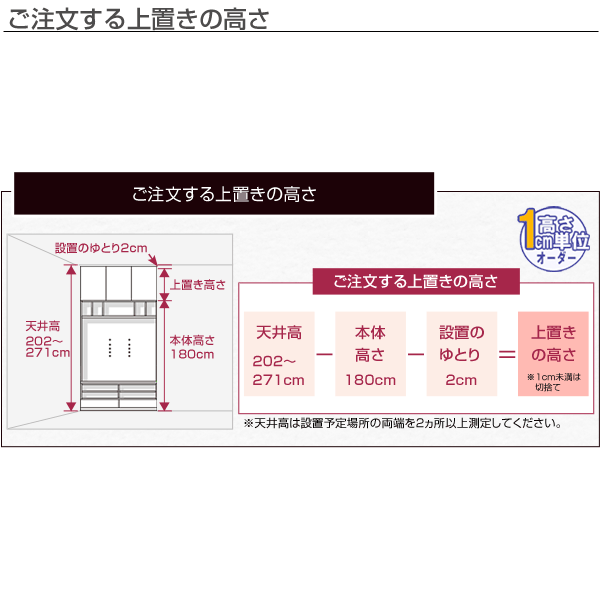 上置き・梁よけBOX・フィラーBOXをご注文の場合は、天井高さから、マイナス182cmの高さでご注文ください。